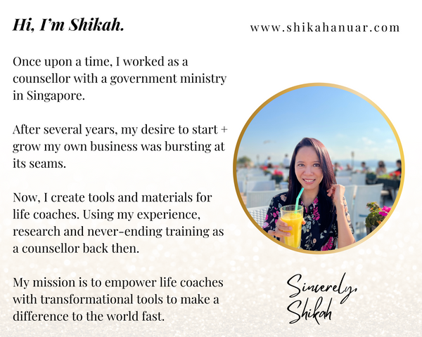 ⭐️ Gain your customers’ trust and offer courses created with real life experience! My products are written by me, backed by YEARS of counselling experience under my belt. Need proof? I run a registered business - Shikah Anuar Communications. And I have an active blog at shikahanuar.com for you to see my writing style. ⭐️