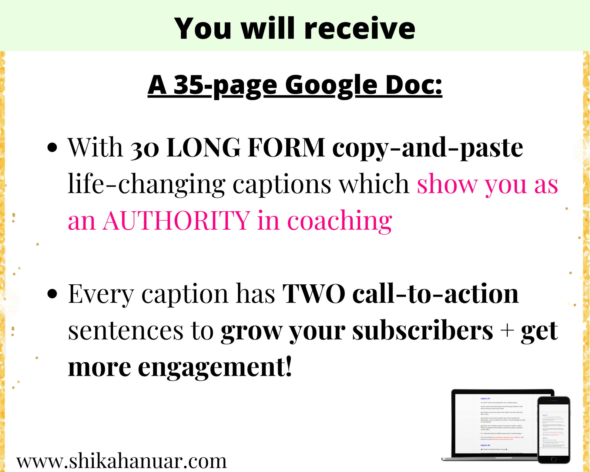 - With 30 copy-and-paste life changing captions which portray you as an AUTHORITY in coaching (A total of 35 Google Doc pages!)