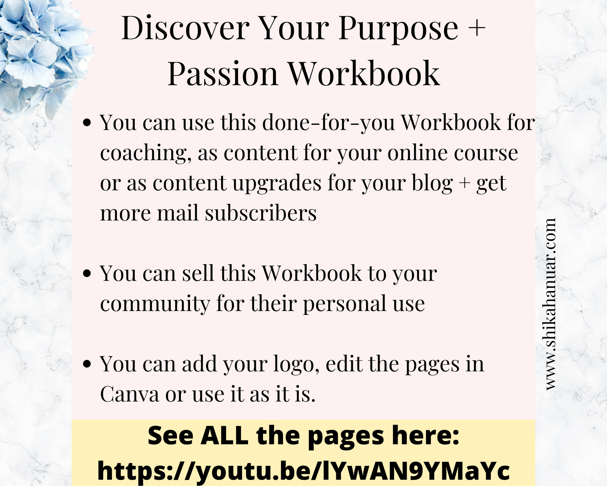 You can quickly brand this workbook with your logo. Your branding colours. Your fonts, your own pictures. Make it truly YOURS with Canva. Or use the Discover your Life Purpose & Passion Workbook as it is.