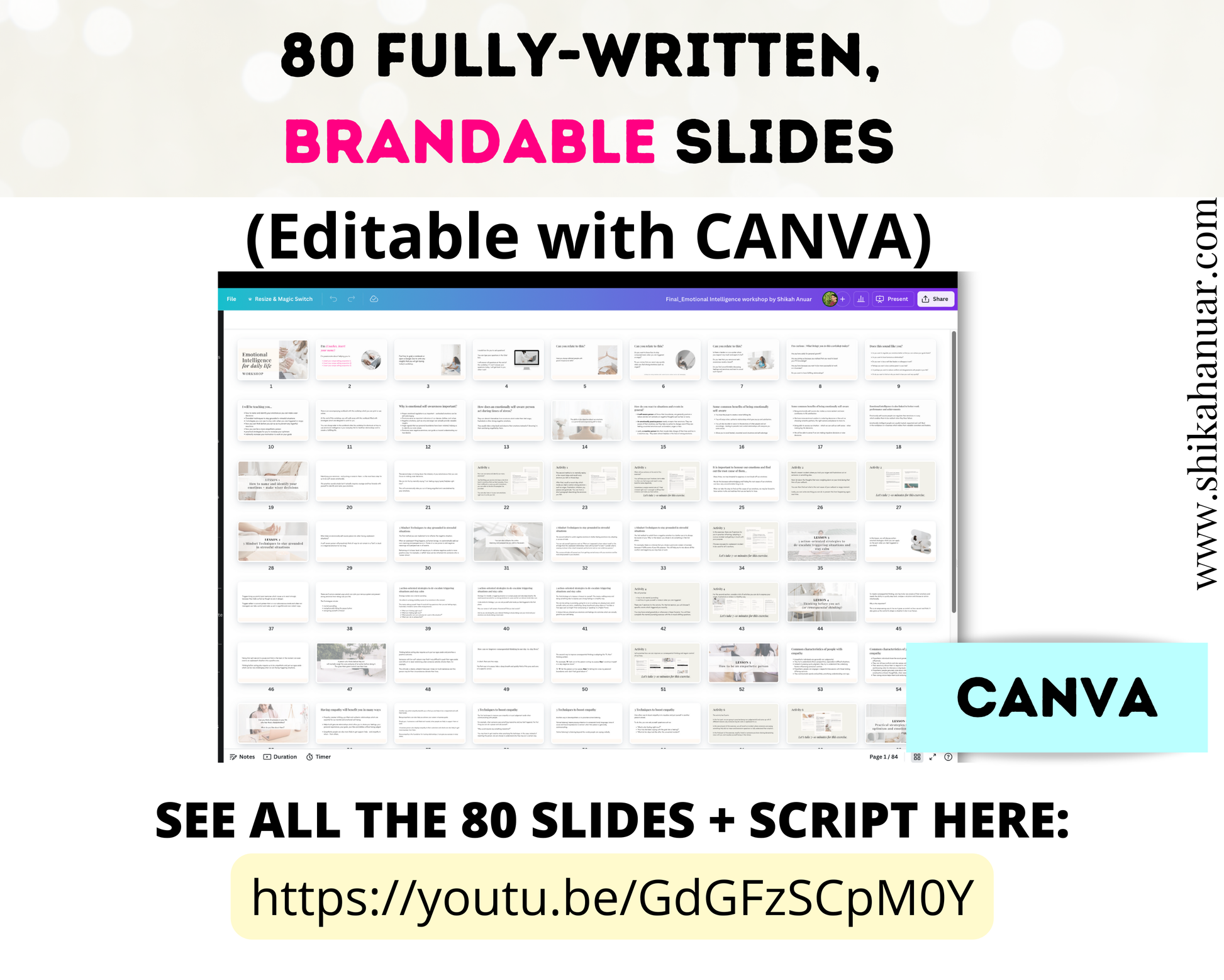 ✔️ A power-packed presentation with 80 well thought-out slides which you can edit to your audience’s needs (edit using Canva)
