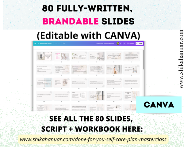✔️ A full ready-to-go masterclass with 80 well-written slides which you can edit to suit your audience’s needs if you want to. (edit using Canva)