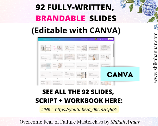 ✔️ A full ready-to-go masterclass with 92 well-written slides which you can edit to suit your audience’s needs if you want to. (edit using the free version of Canva)