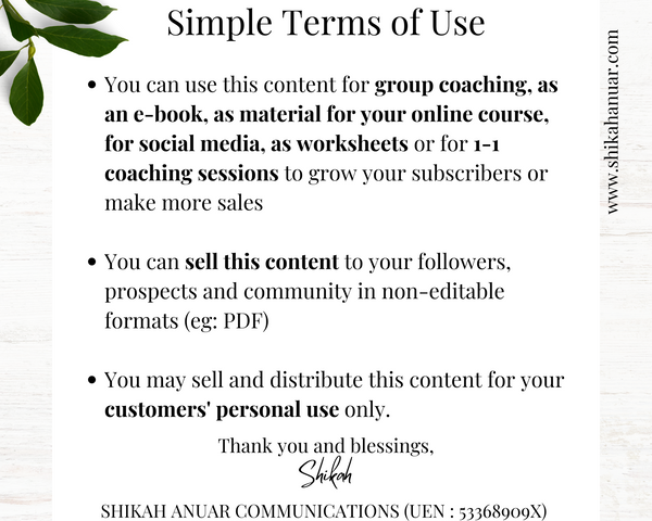 ⭐️My products are written by me, backed by YEARS of counselling experience under my belt. Need proof? I run a registered business - Shikah Anuar Communications. And I have an active blog at shikahanuar.com for you to see my writing style. Gain your customers’ TRUST and offer Workbooks which TRULY transform their lives! ⭐️