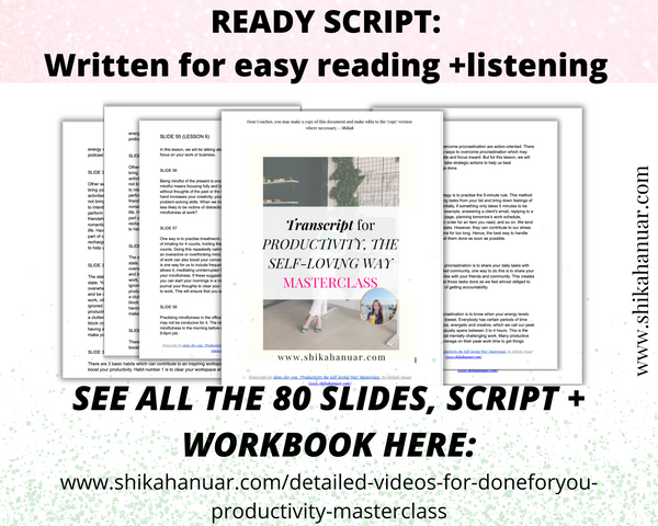 To make things easier, I’ve created a done-for-you productivity masterclass for you. It’s ready to launch with 80 power-packed slides, an accompanying workbook and a script