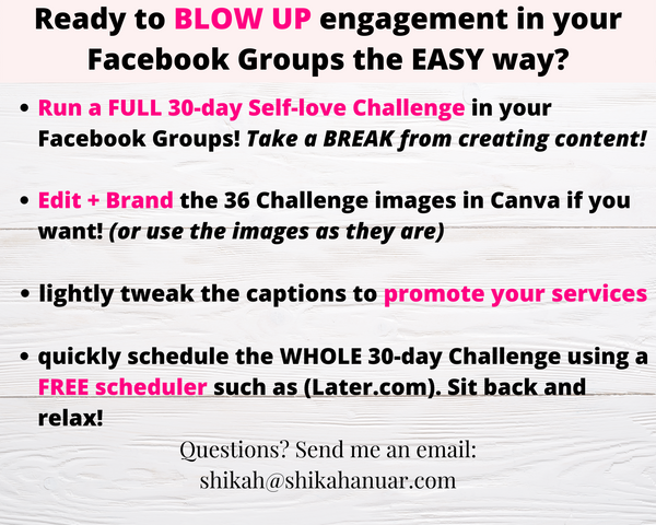 ✨Attention: Coaches who are struggling to write VALUABLE posts in your Facebook Group! If you long to engage with your followers + be seen as an expert in self-help + have MORE time to yourself, then this 30-Day Self Love Challenge is exactly what you need!✨