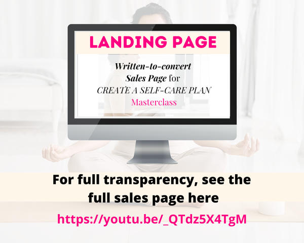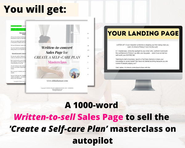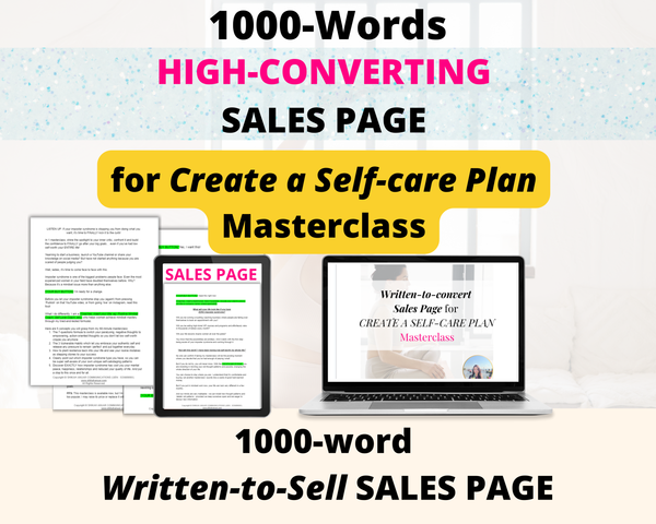 - Instant access to a 1000-word written-to-convert sales page in Google Docs to promote the done-for-you Create a Self-Care Plan masterclass
