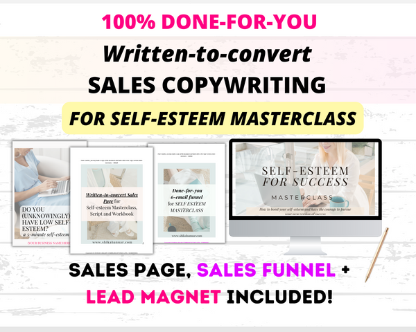 You can see this sales copywriting bundle as your 24/7 salesperson to help you sell the ‘Self-esteem for Success’ masterclass even as you sleep!