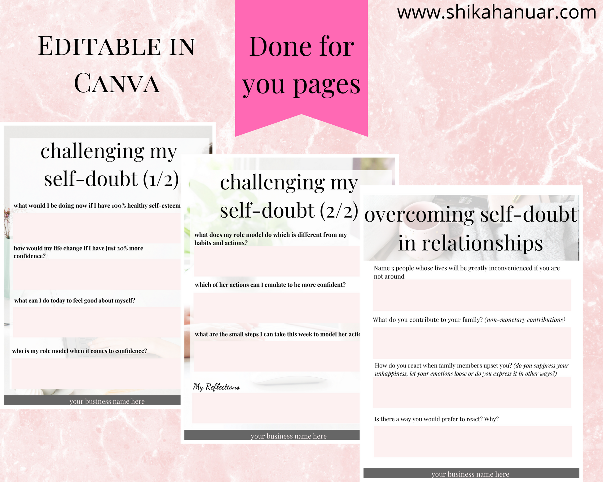 You will receive 21 pages of strategies, tools and advice to overcome self-doubt and boost self-esteem (including 3 editable cover pages) which you can use individually or combine to form a workbook.