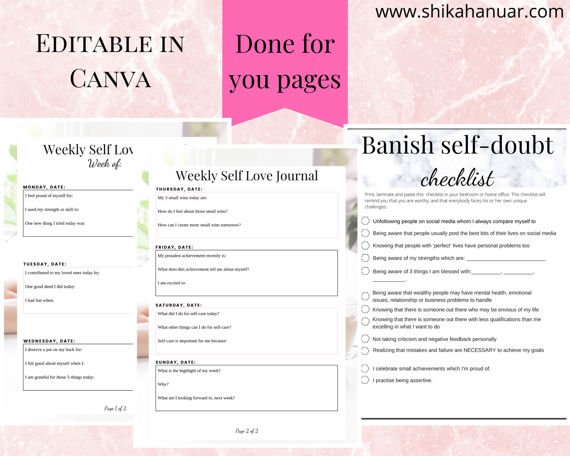 - (2 pages) Weekly Self-Love Journal to build self-love