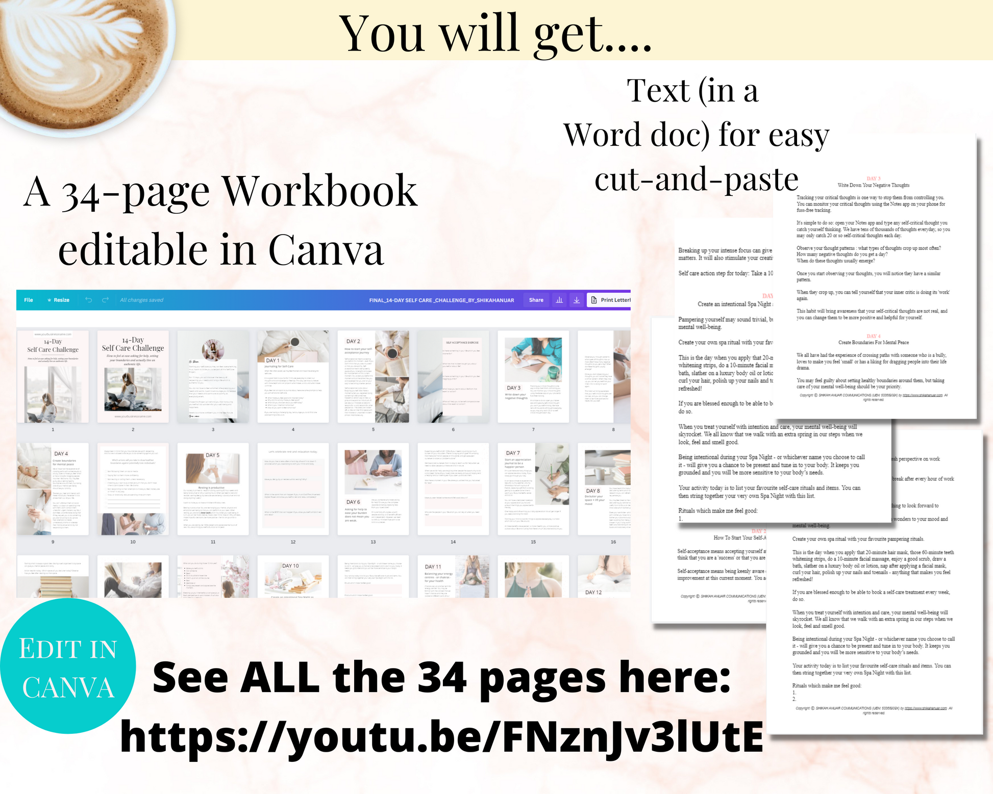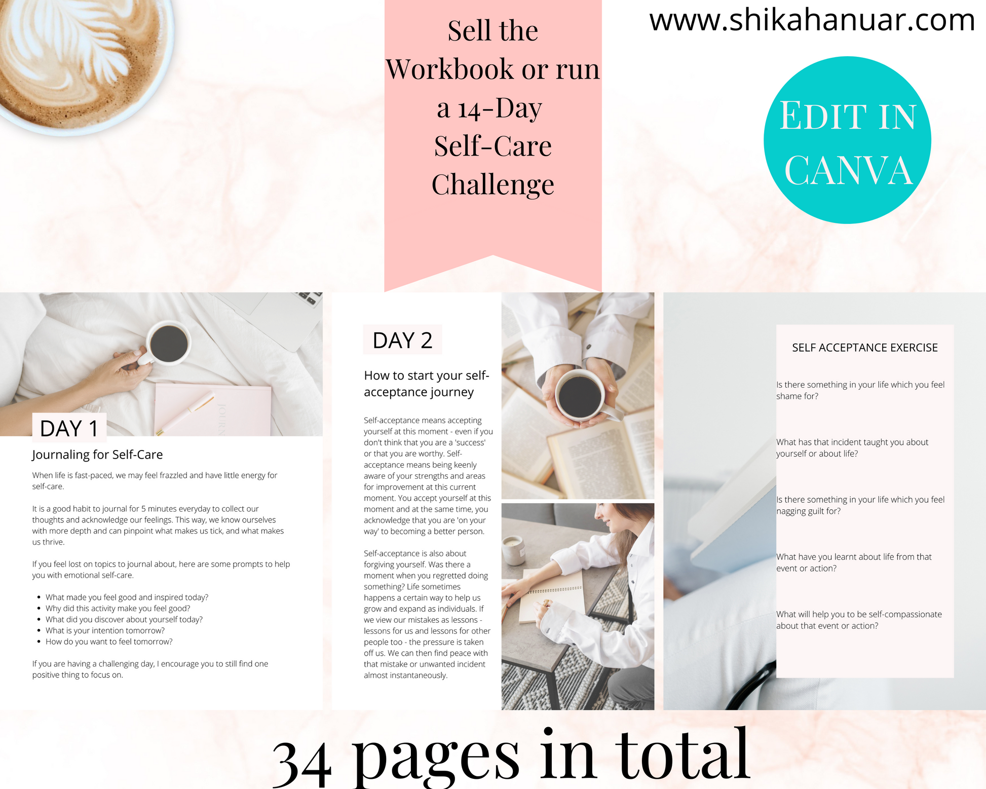 ✔️ 34 beautifully-designed pages : ready to sell as a 14-Day Self Care Challenge Workbook