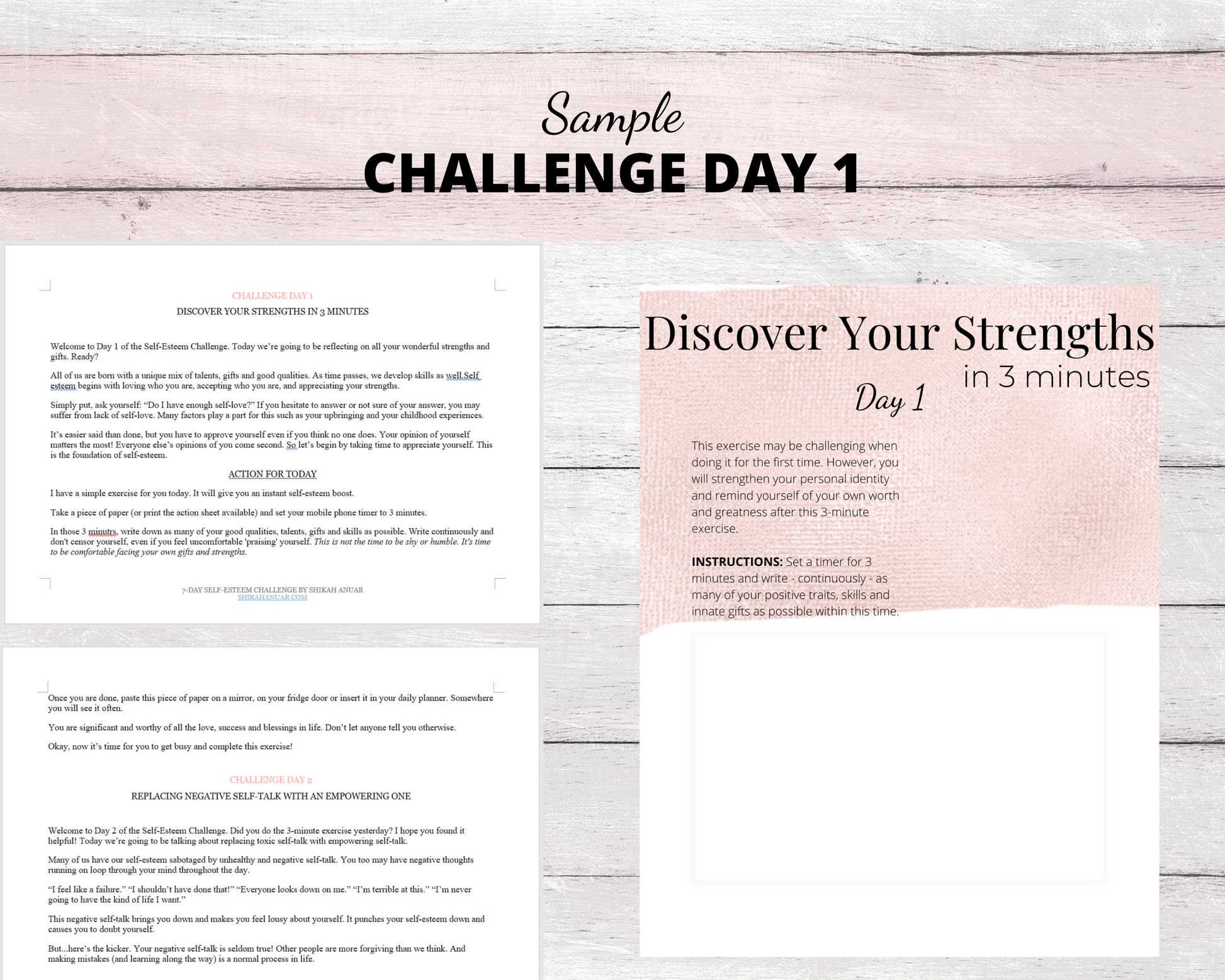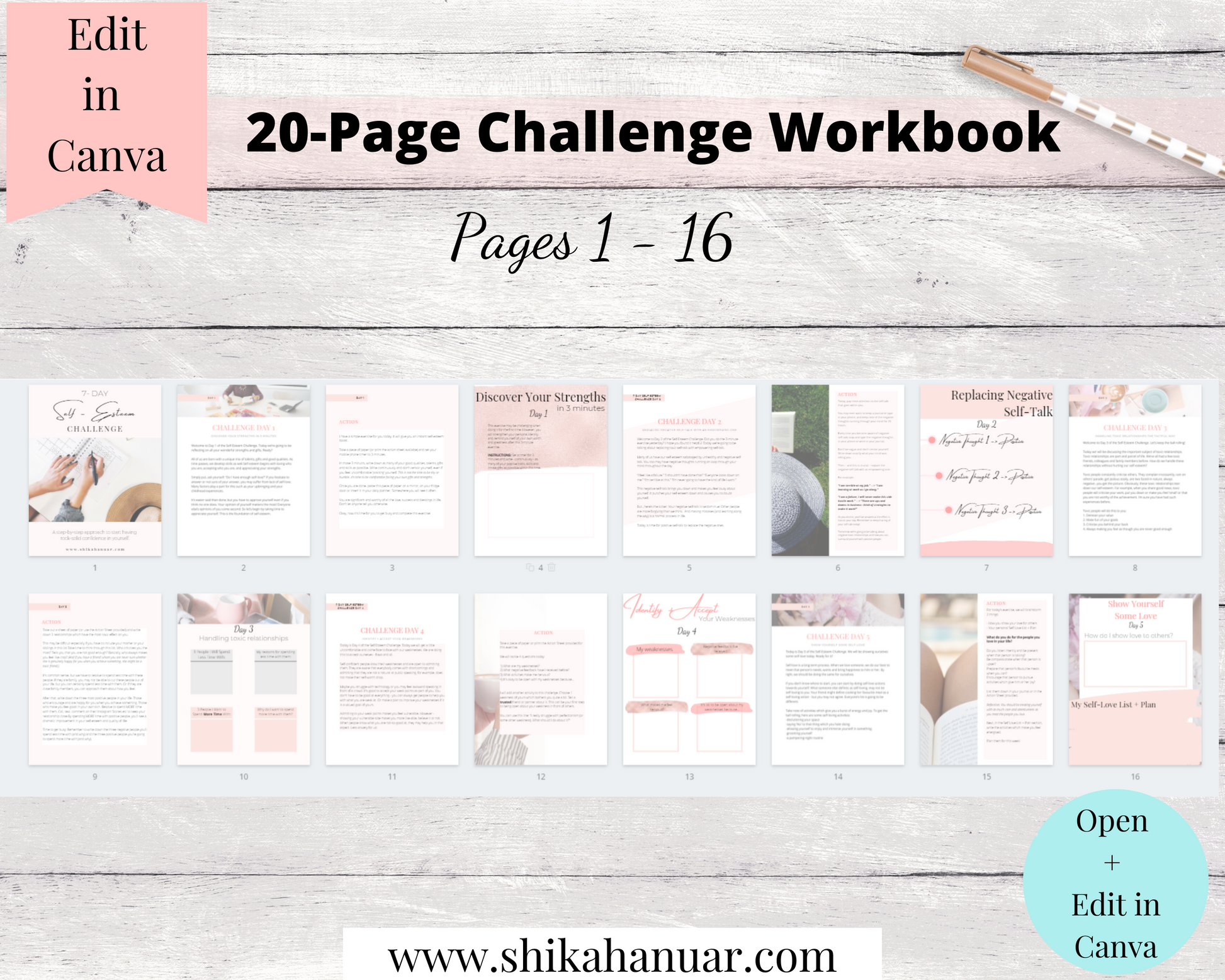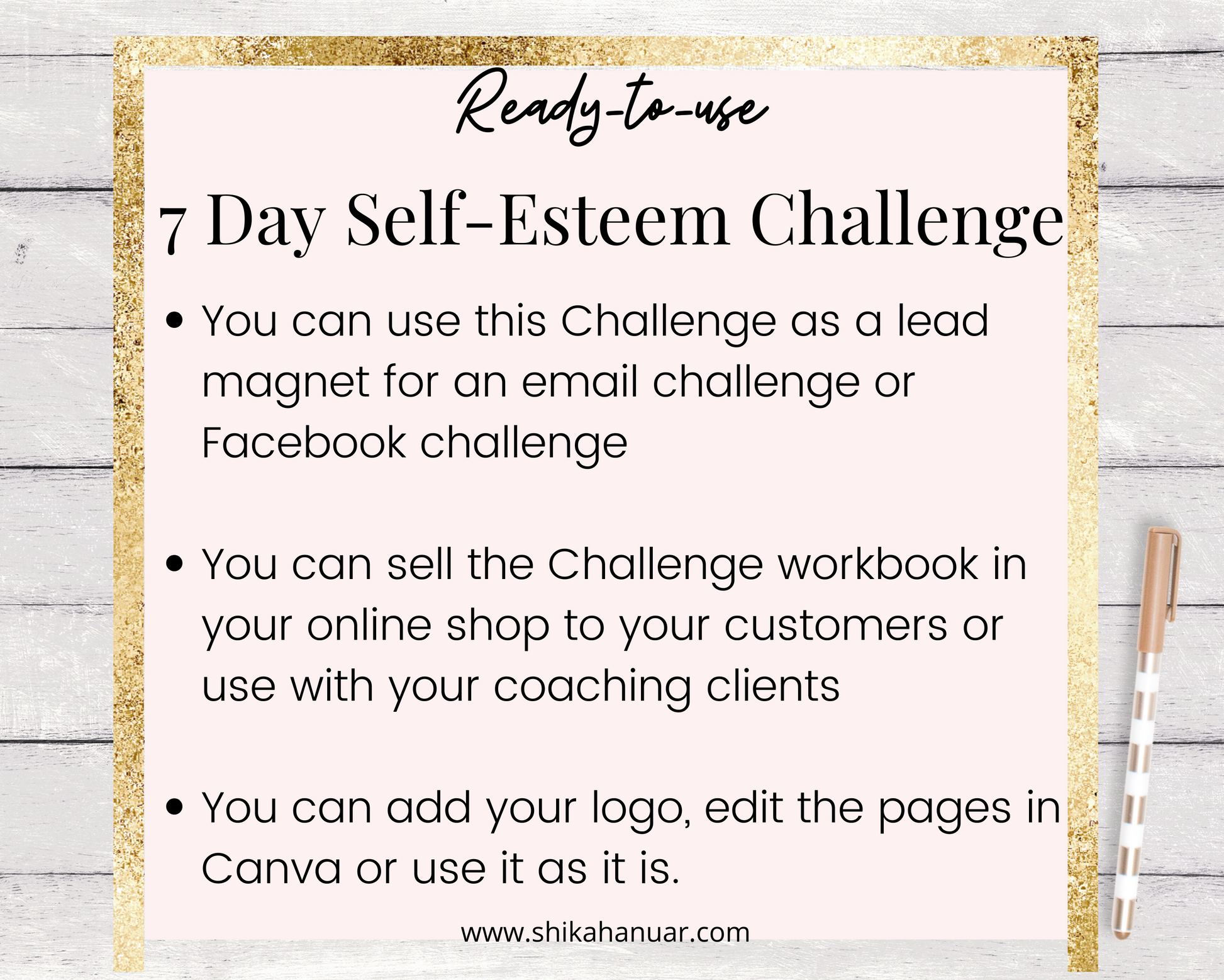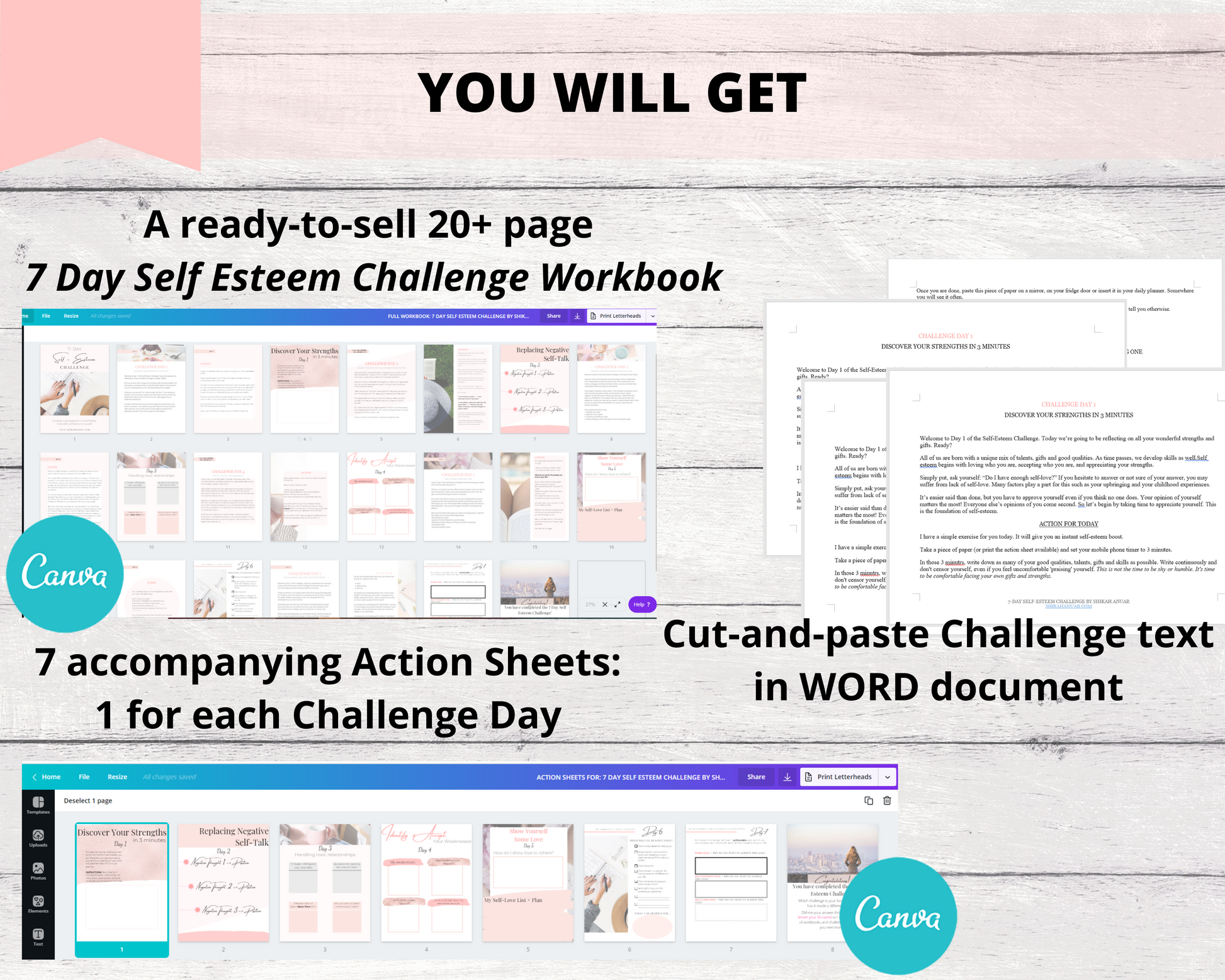 ✔️ Both combined into one fully designed ready-to-sell 7 Days Self Esteem Challenge Workbook which you can choose to edit + brand in Canva)
