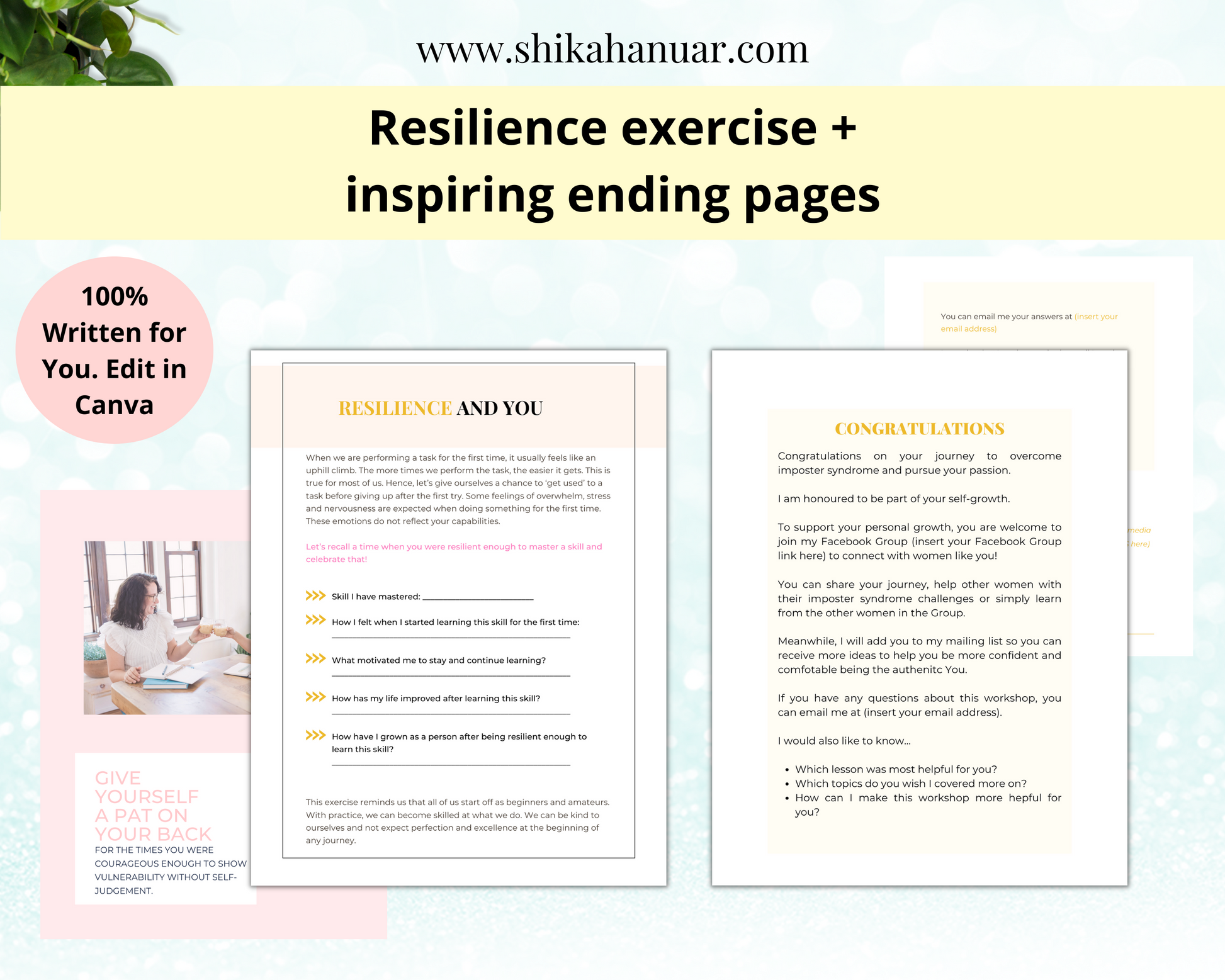 A 24-page Overcome Imposter Syndrome workbook (all pages are editable in Canva)