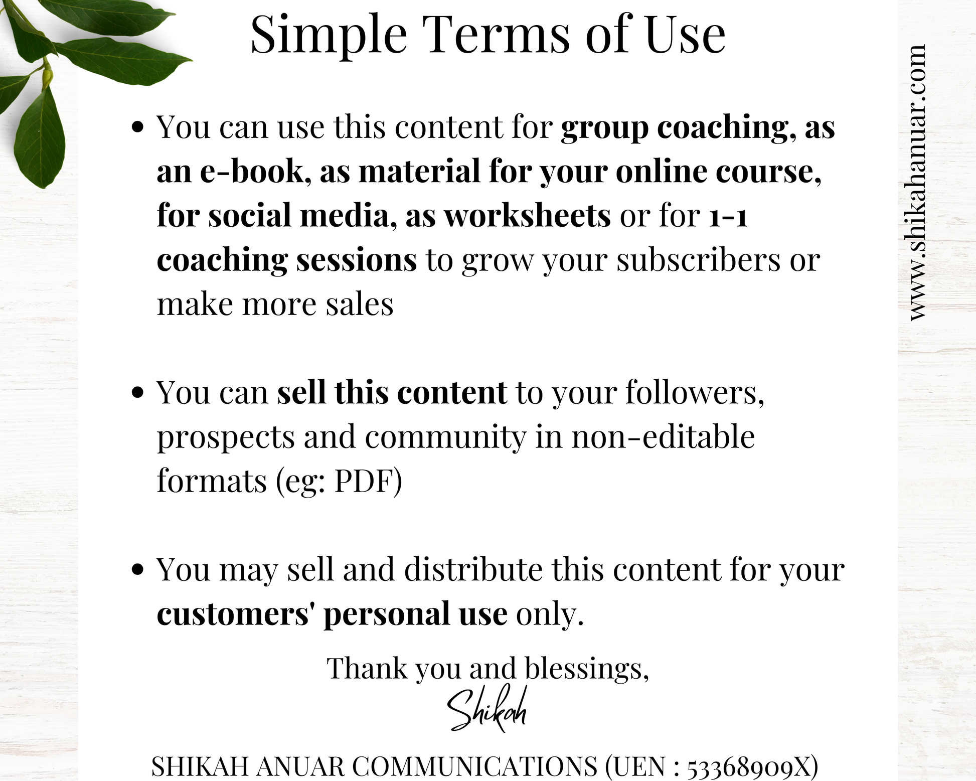⭐️My products are written by me, backed by YEARS of counselling experience under my belt. Need proof? I run a registered business - Shikah Anuar Communications. And I have an active blog at shikahanuar.com for you to see my writing style. Gain your customers’ TRUST and offer Workbooks which TRULY transform their lives! ⭐️